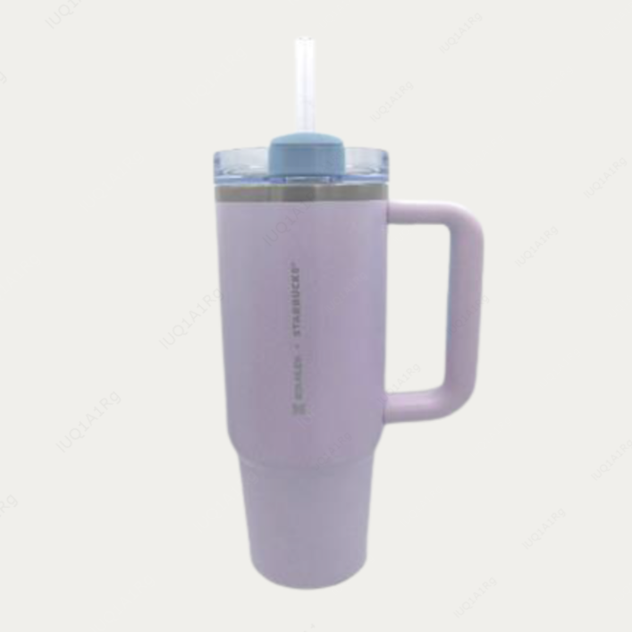 "Copo lilás com logotipo Stanley + Starbucks prateado feito com 90% de aço inoxidável reciclado, com alça lilás e azul. Tampa e canudo lilás com tampa rotativa azul-claro, para bebidas quentes e frias para viagem - 887ml.