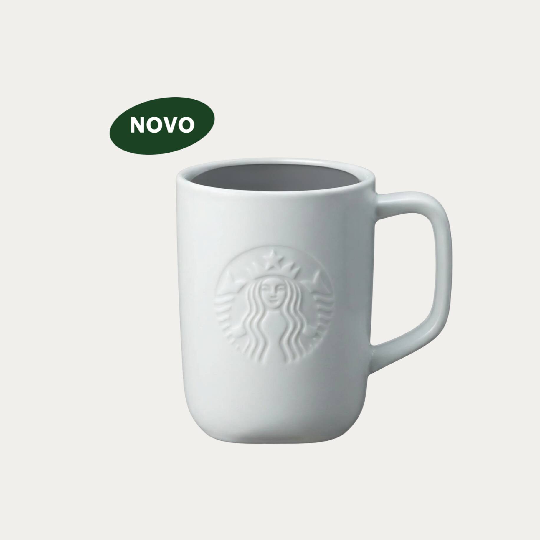 "Caneca verde clara com logotipo da Sereia na parte frontal e decalque em relevo “FEITA COM CERÂMICA RECICLADA” na parte traseira, para bebidas quentes ou frias - 473ml.