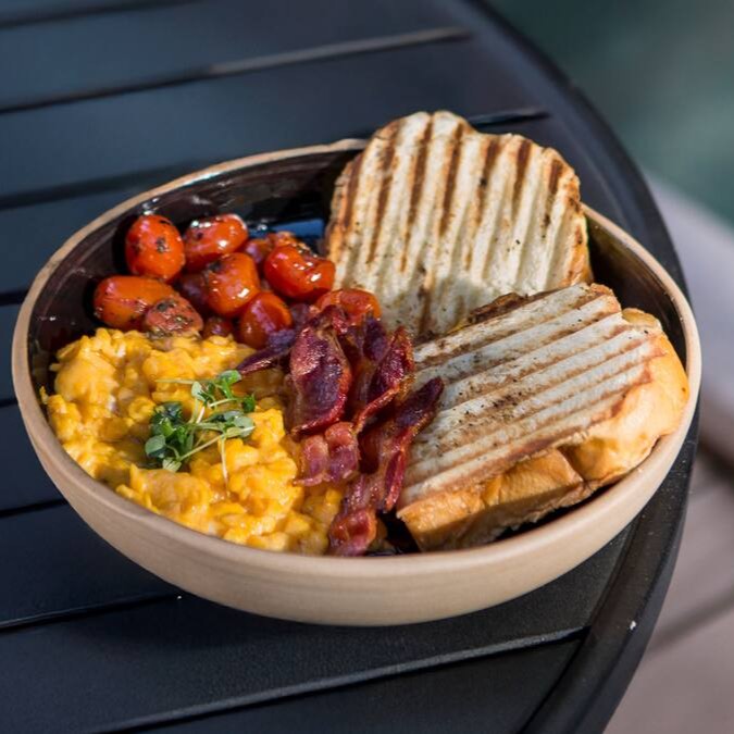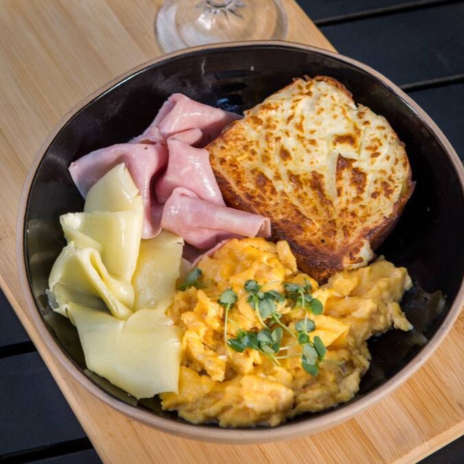 Delicioso Brunch composto por pão brioche, ovos mexidos, bacon, presunto, muçarela e tomate confit.