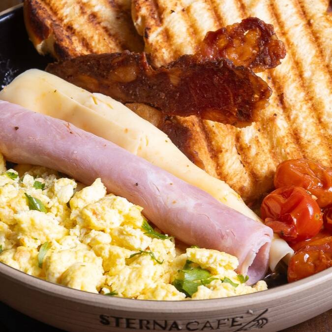 Duas fatias de brioche levemente tostado, ovo mexido, bacon, tomate confit e uma fatia de bolo caseiro da Sterna.