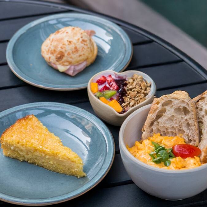 Panini de pão de queijo, pão de fermentação natural, bolo caseiro fofinho, ovos mexidos cremosos e parfait de frutas frescas. Bebida não inclusa.