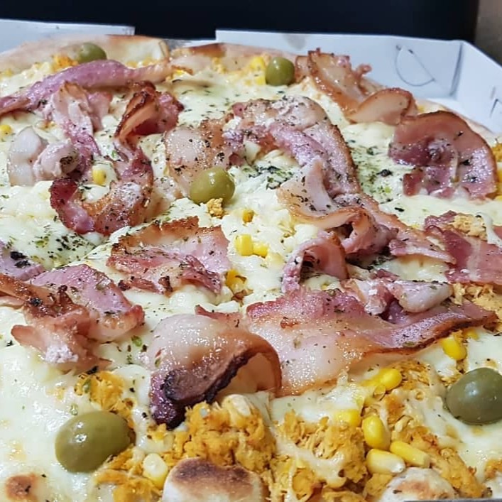 Peito de peru, molho especial da casa, mussarela, requeijão cremoso, bacon, azeitonas e oregano