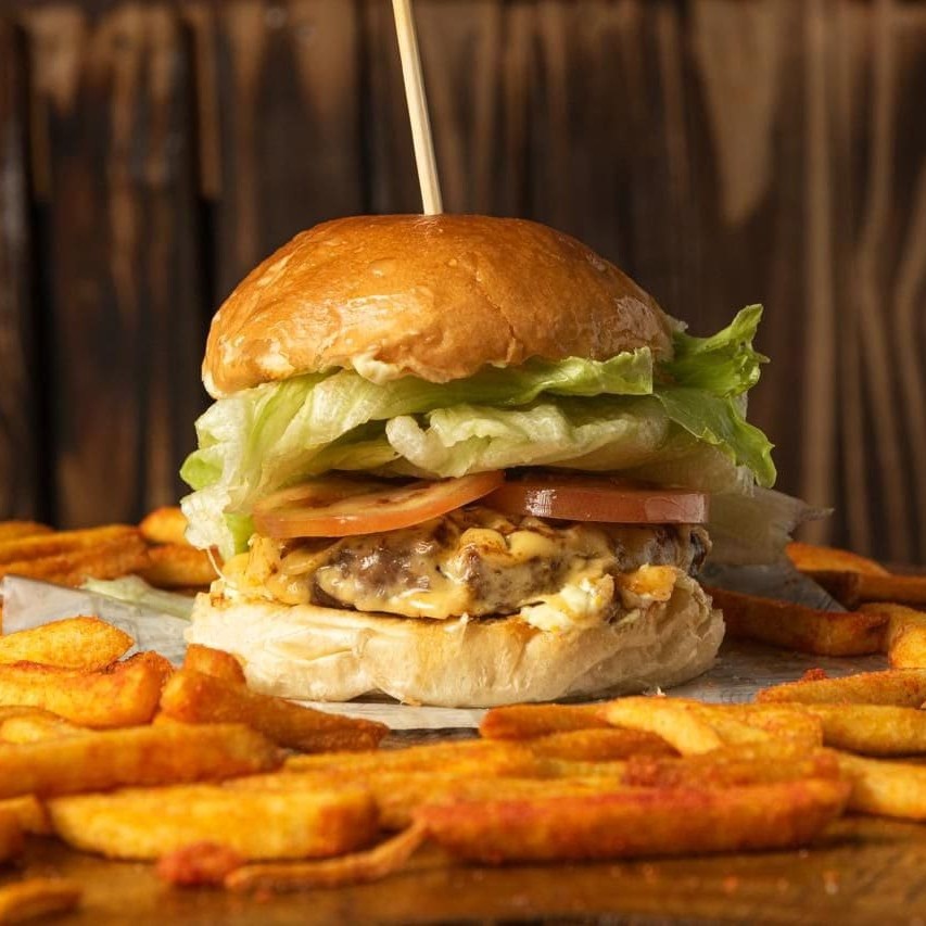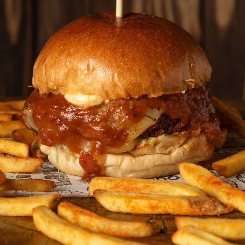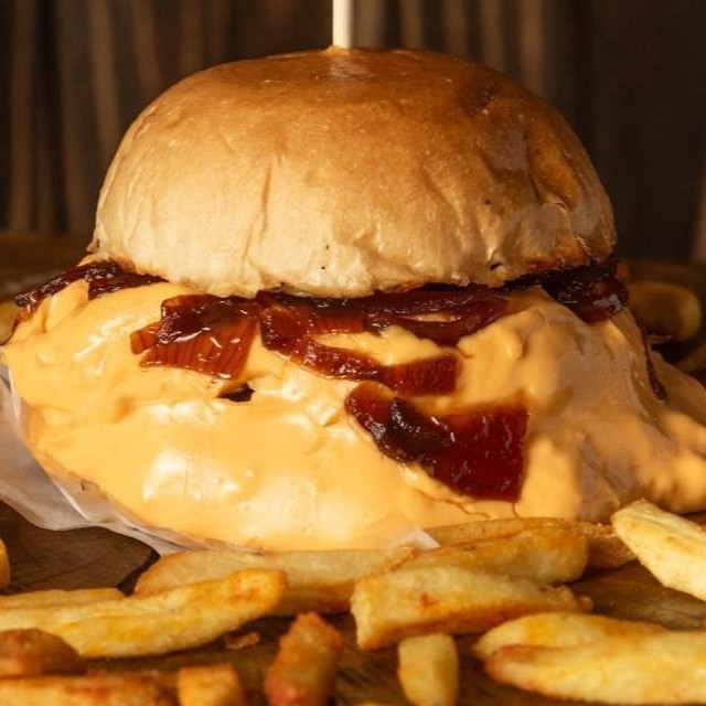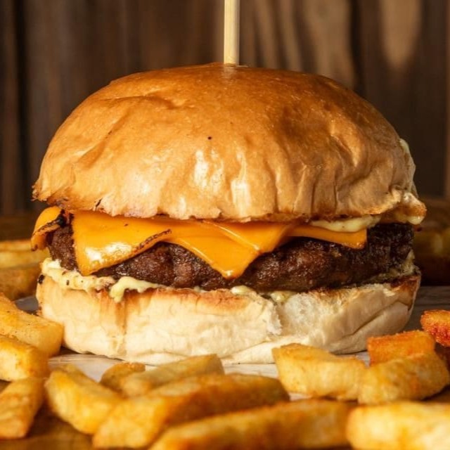 Um bland de carnes selecionadas de hambúrguer pesando 160g, molho street, queijo cheddar e pão australiano ou pão brioche.