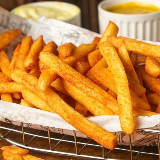 Batata frita temperada com páprica defumada e sal, mix de queijos flambado e tiras de calabresa.