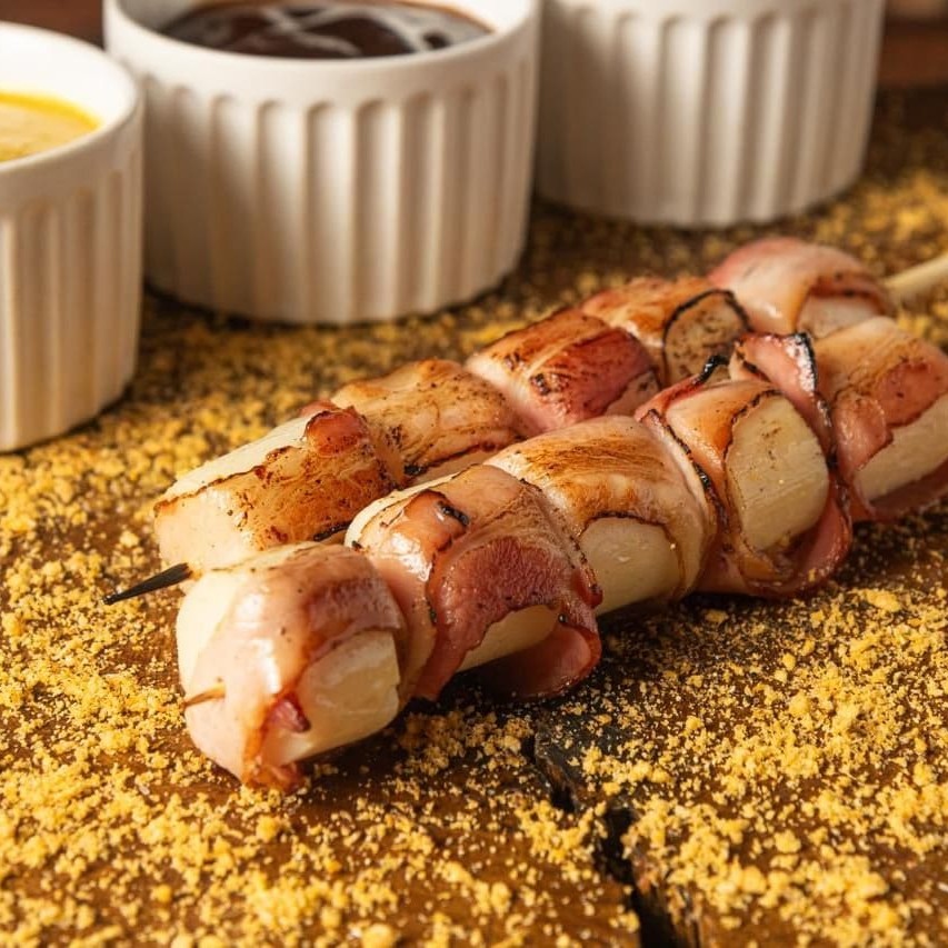 Palmito envolvido com tiras de bacon. Leveza com sabor marcante!