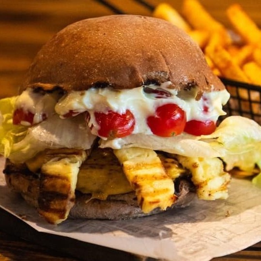 Queijo coalho, queijo prato, tomate cereja, maionese de manjericão com pedaçoes de azeitona e alface americana no pão australiano ou papo seco. Batata frita a parte