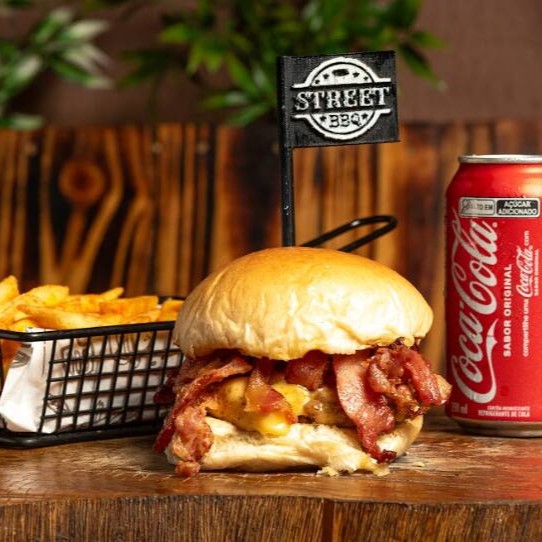 Hambúrguer com 160g de blend de carnes selecionadas, molho Street exclusivo, queijo prato derretido e bacon em fatias crocantes, no pão brioche ou australiano. O clássico mais pedido que nunca falha! Simples, suculento e irresistível!.