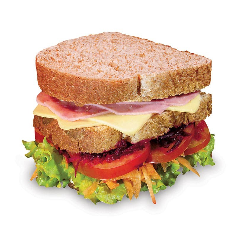3 fatias de pão integral light, maionese light, presunto, queijo mussarela, alface, beterraba ralada, cenoura ralada e tomate