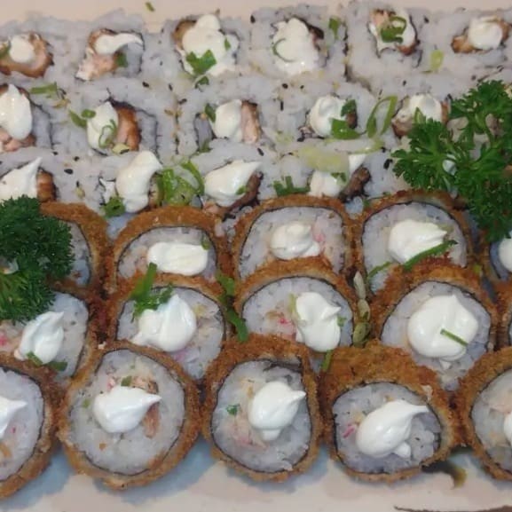 SUSHI ENROLADO EMPANADO COM SKIN GRELHADO CREAM CHESE AO MOLHO TARE