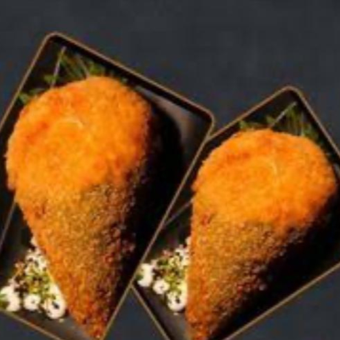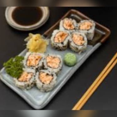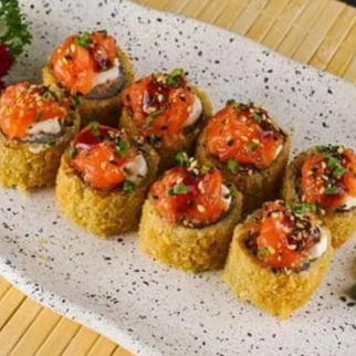 Enrolado de arroz, salmão, cream cheese, empanado e frito e finalizado com salmão batido .