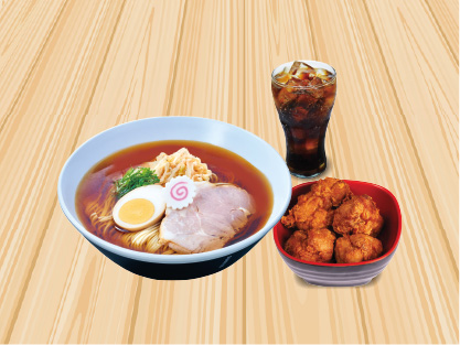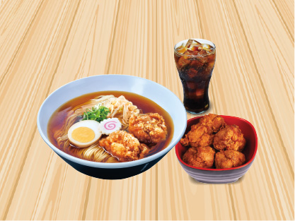 Tokyo Kara ague Lamen - Caldo especial preparado a base de shoyu, carne suína e frango, servido com macarrão, broto de feijão (moyashi), naruto (carne de peixe), ovo temperado e acompanhado com o nosso delicioso Kara ague.