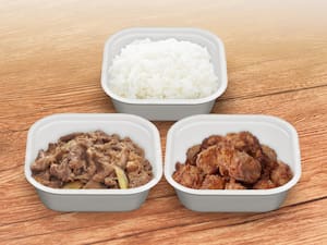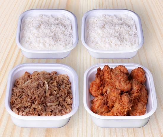 Combo especial com 4 porções de arroz M, 3 porções de Gyu sara M e 12 unidades de Kara agues.