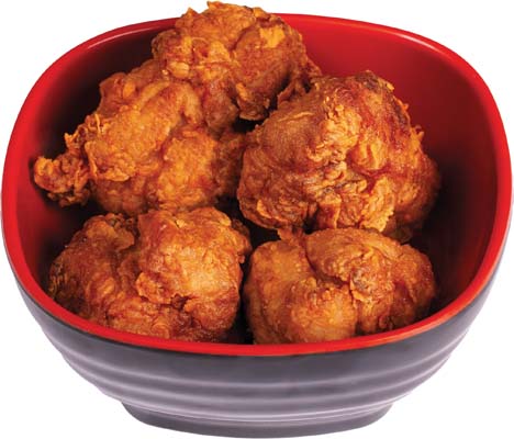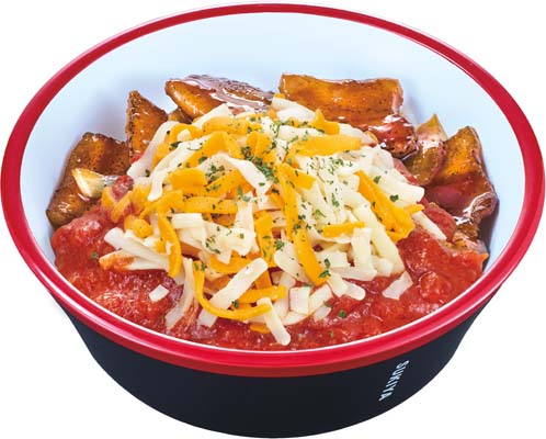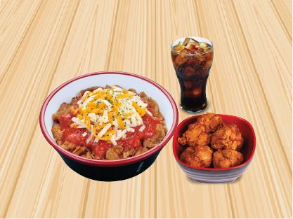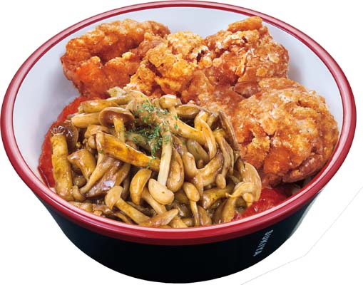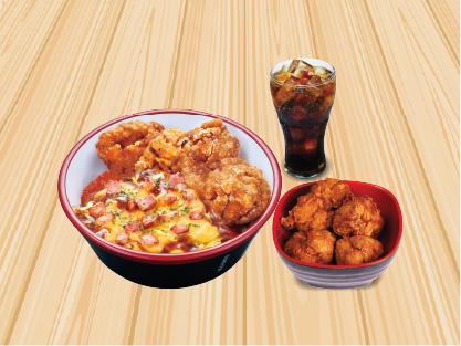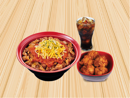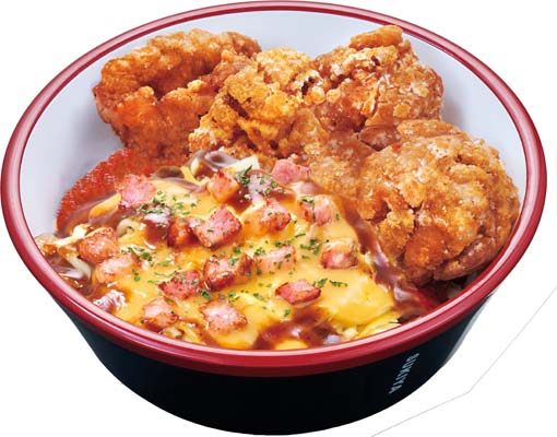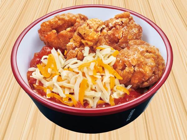 A combinação de kara-ague (frango frito) Sukiya com molho de tomate caseiro e Mix queijos.