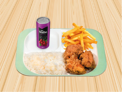 Nosso delicioso kara-ague com arroz japonês, batata frita e um suco.