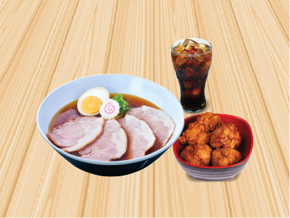 Tcha – Shu Lamen - Caldo especial preparado a base de shoyu, carne suína e frango, servido com macarrão, naruto (carne de peixe), ovo temperado e acompanhado com tcha shu (fatias de lombo de porco marinado).