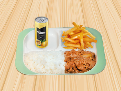 Carne especial Sukiya acompanhado de arroz japonês, batata frita e um suco.