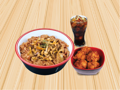 Nosso blend de carne Angus é fatiada e cozida com molho especial por cima do arroz japonês coberto com shimeji na manteiga.