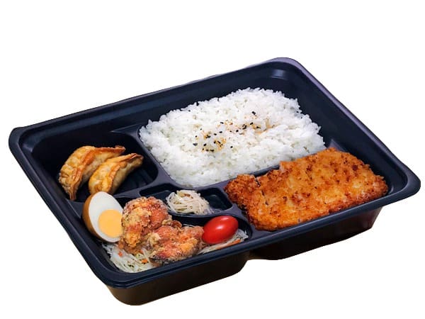 Teishoku de Tonkatsu (lombo de porco), arroz japonês, kara ague (frango frito), gyoza bovino, ovo