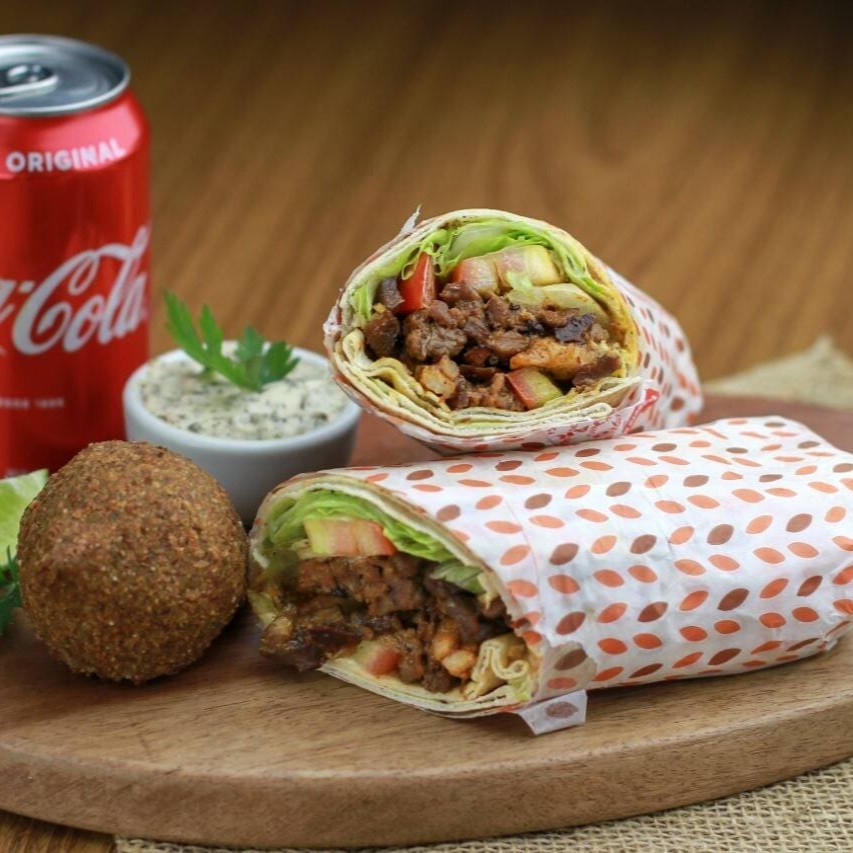 Carne e frango picada temperada com salada, tomate, molho especial no pão sírio