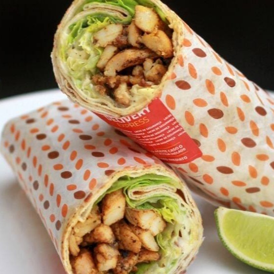 Tiras de Frango temperado e salada, tomate,molho especial no pão sírio