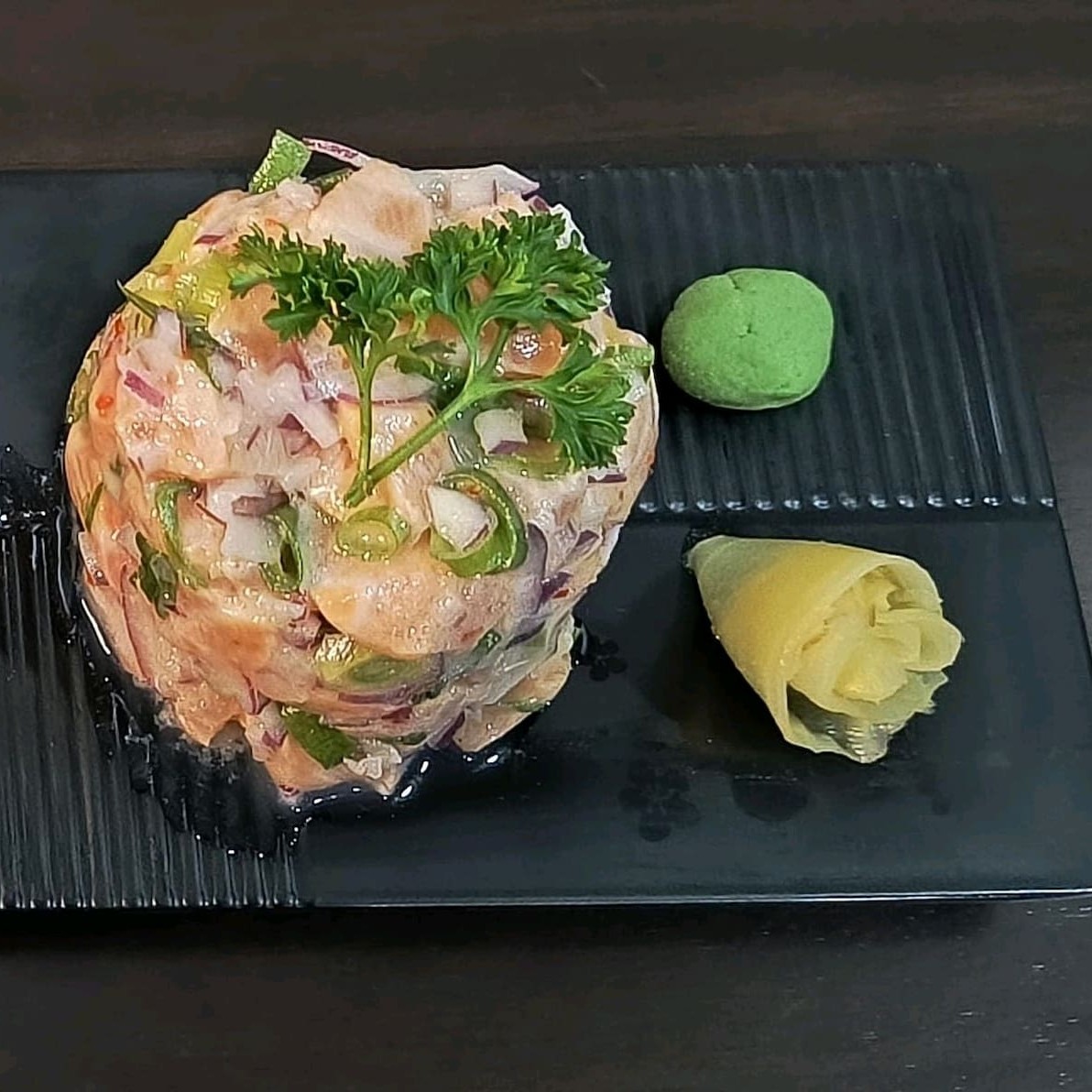Salmão fresco, cebola roxa, pimenta, limão, azeite e gergelim.