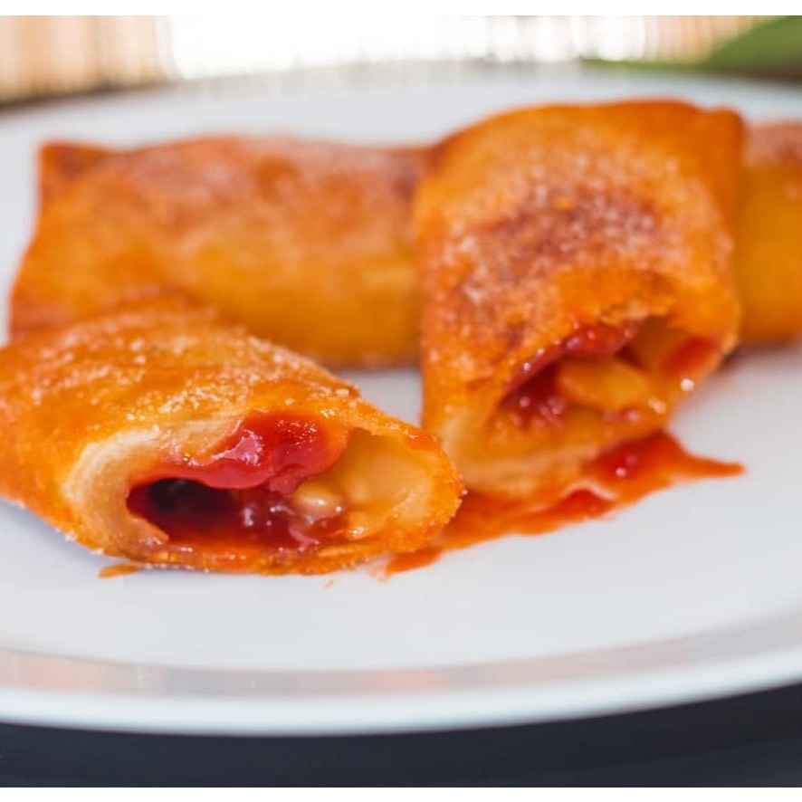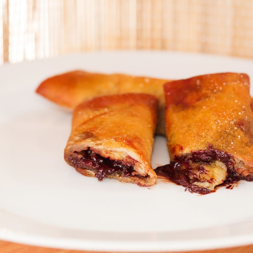 Massa fina crocante recheada com chocolate e banana, passado no açúcar com canela.