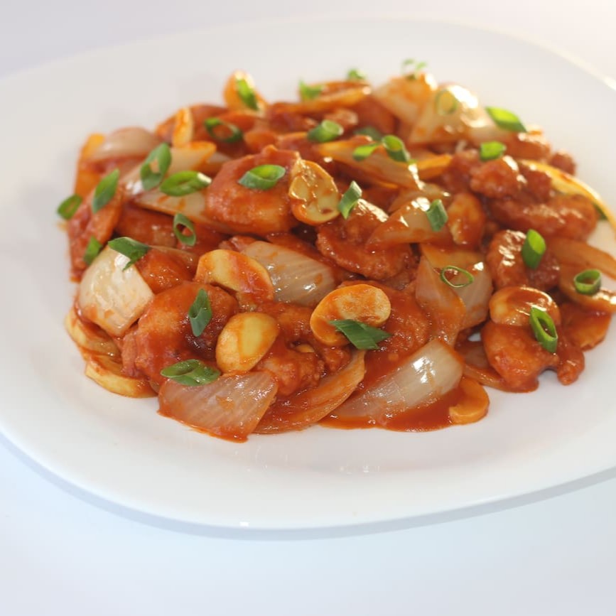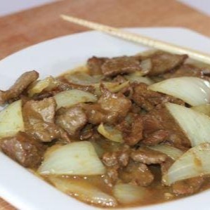 Carne fatiada com cebola ao molho curry, levemente picante.
