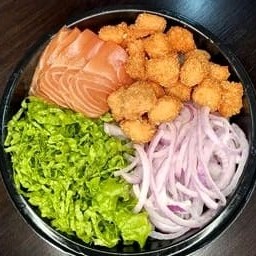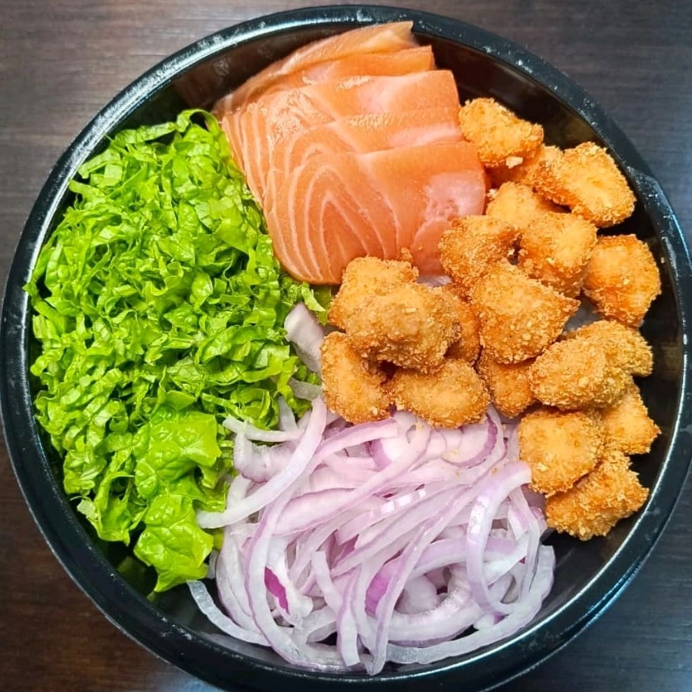 Delicioso poke ( Base salada alface crespa ), Salada alface crespa, Sashimi de salmão fresco, Salmão empanado em cubos, e cebola roxa.. (Acompanha molhos)