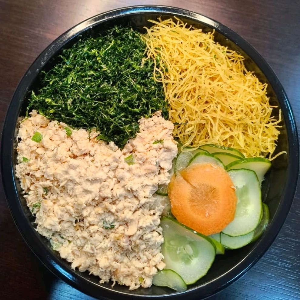 Delicioso poke ( Base Salada de alface )Salmão grelhado, cream cheese, cebolinha, sunomono, couve crocante, batata doce crocante e gergelim.. (Acompanha molhos)