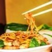 Macarrão chinês, camarões selecionados, legumes e champignon.