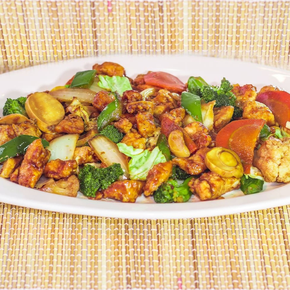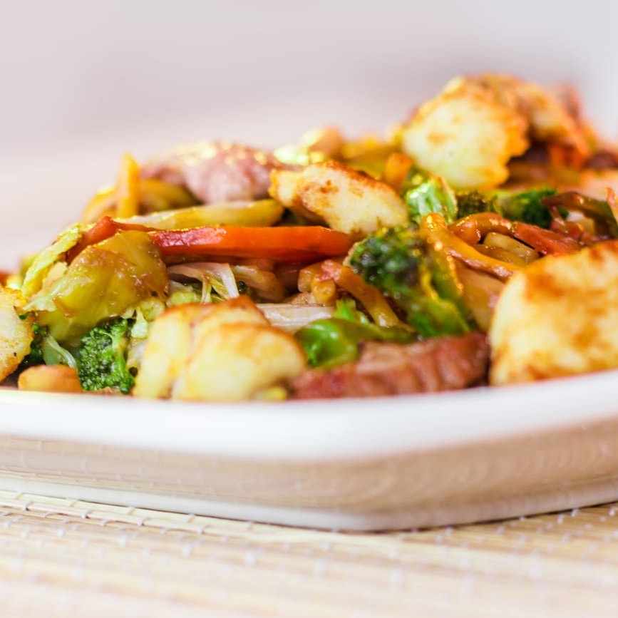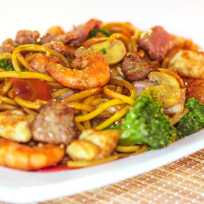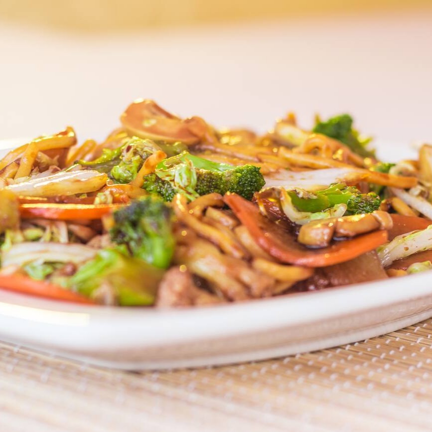 Macarrão chinês, frango, carne, legumes e champignon.