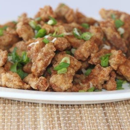Pedaços de frango desossados e fritos cobertos com cebolinha.