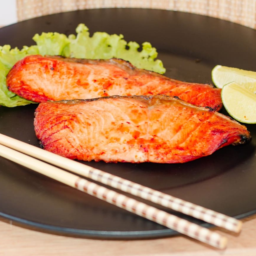 2 postas de salmão grelhado + com molho teriyaki (adocicado) ou shioyaki (com sal)