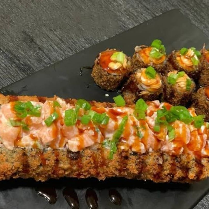 Sushi de salmao com cobertura de salmao grelhado cebolinha e molho tare 24,99 leve outro