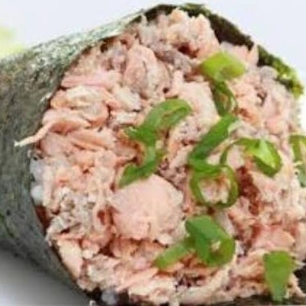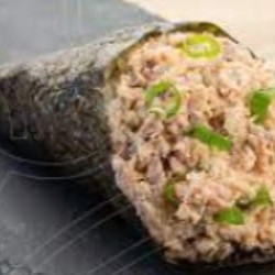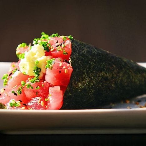 Temaki de atum em pequenos cubos com creame chesse e cebolinha.