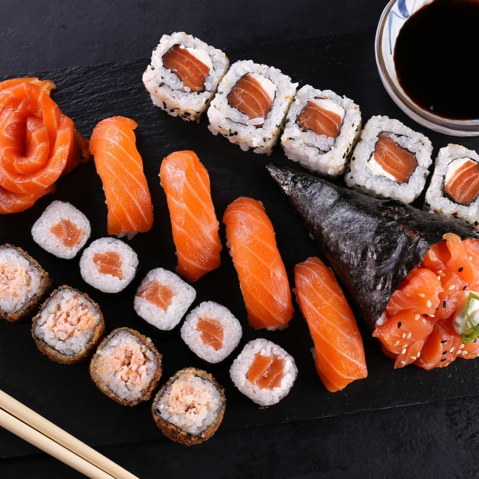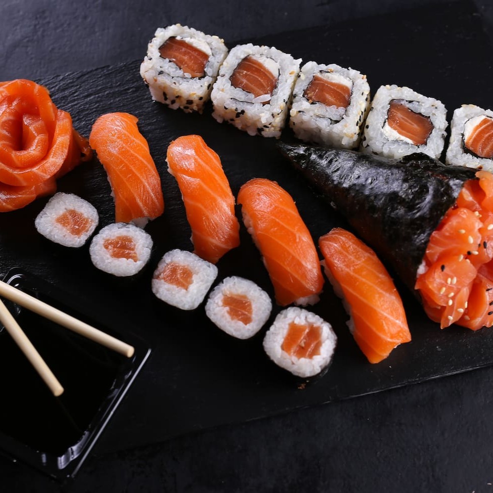 5-sashimi de salmão 5-uramaki de salmão 5-hossomaki de salmão 4- niguiri