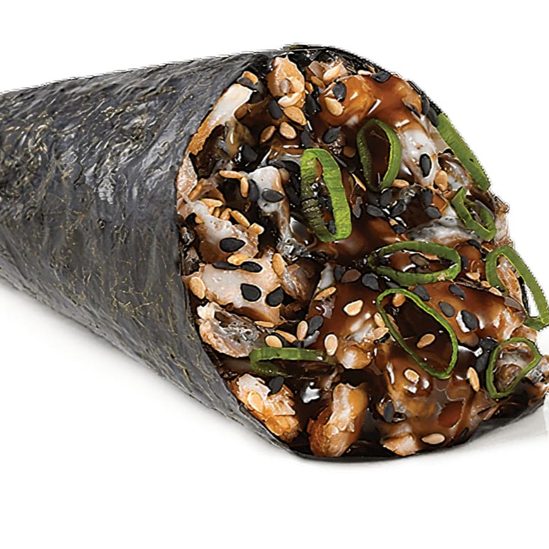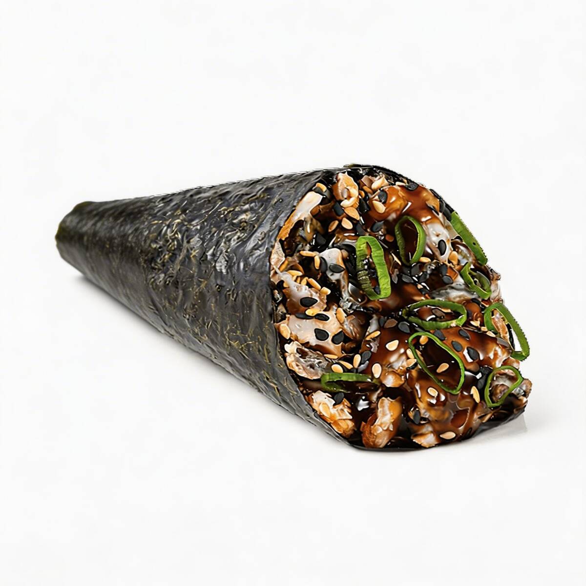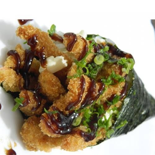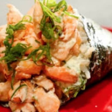 Alga em foma de cone arroz, salmao maçaricado em pequenos cubos com cebolinha e pintada de hondachi