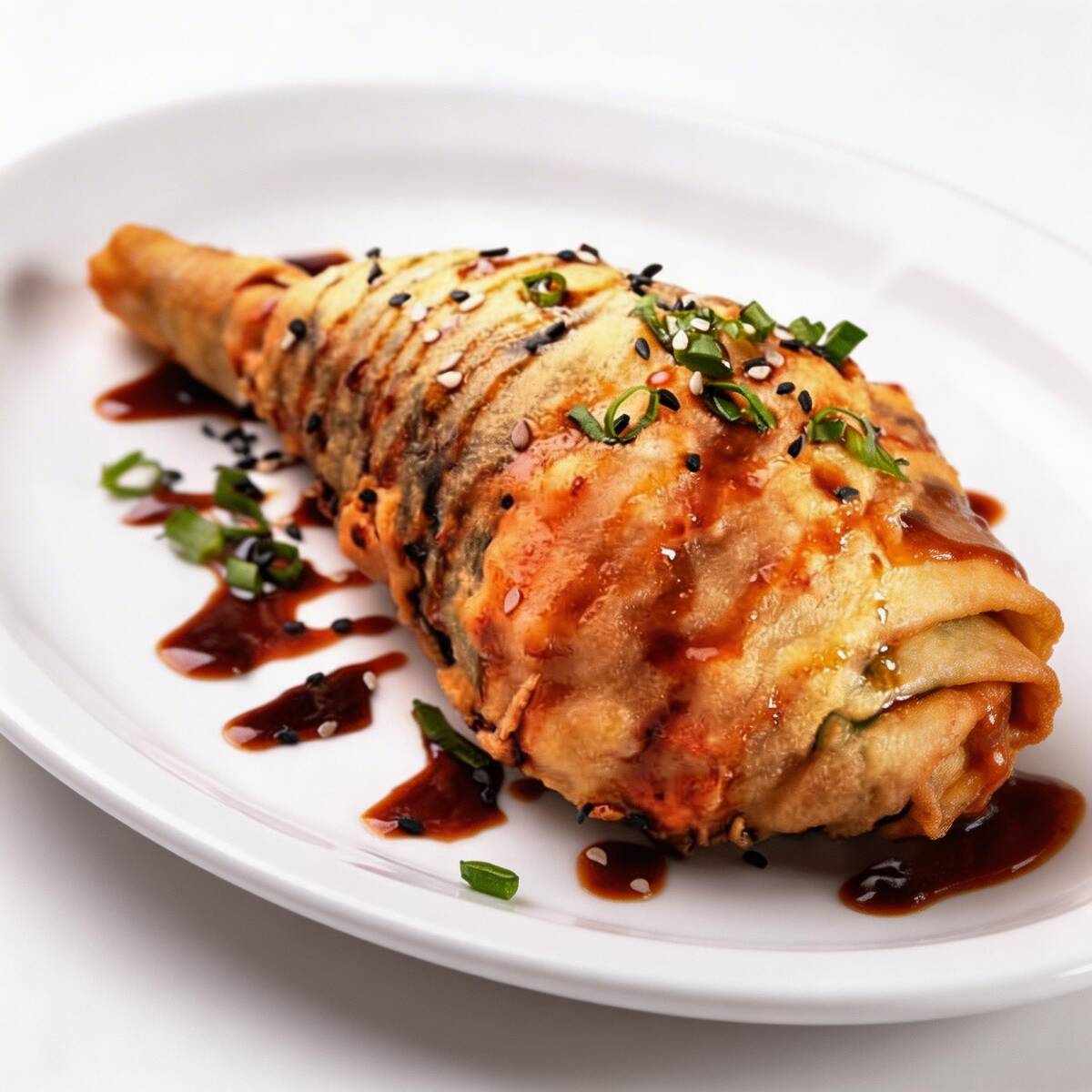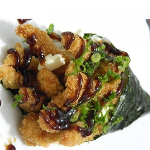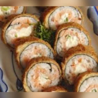 Alga em forma de cone arroz japonês fatias de salmão empanado creamchesse e cebolinha