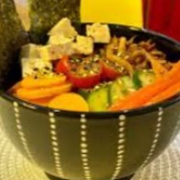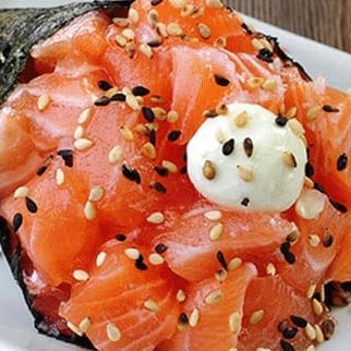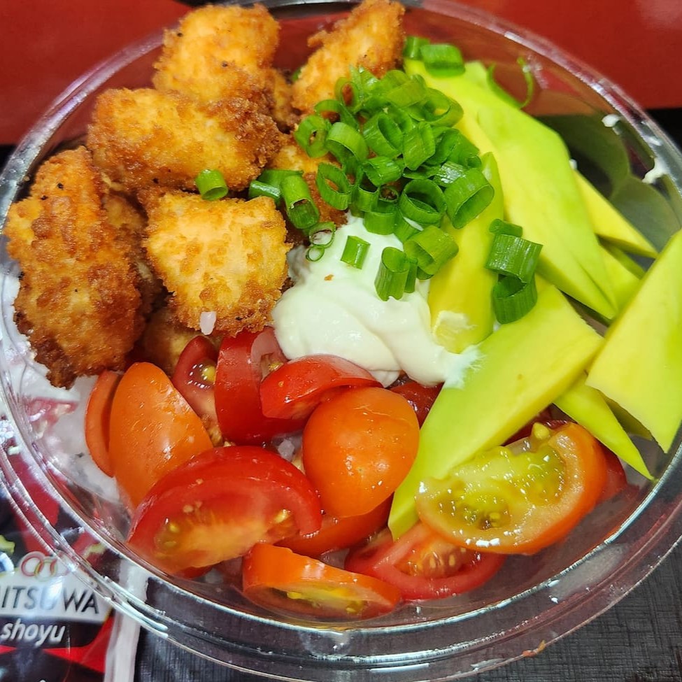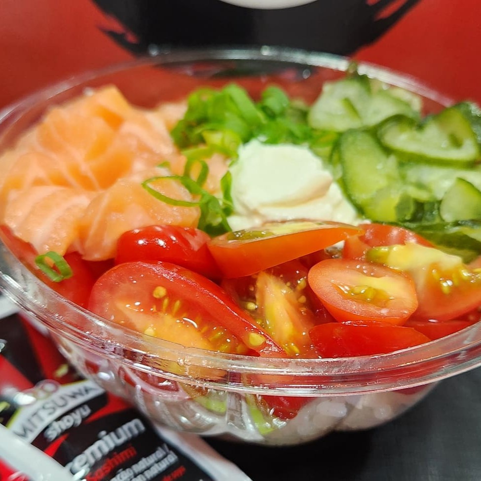 Delicioso poke, feito com produtos selecionados, arroz japonês, salmão em cubos, creame chease, tomate cereja, sunomono, e cebolinha.
