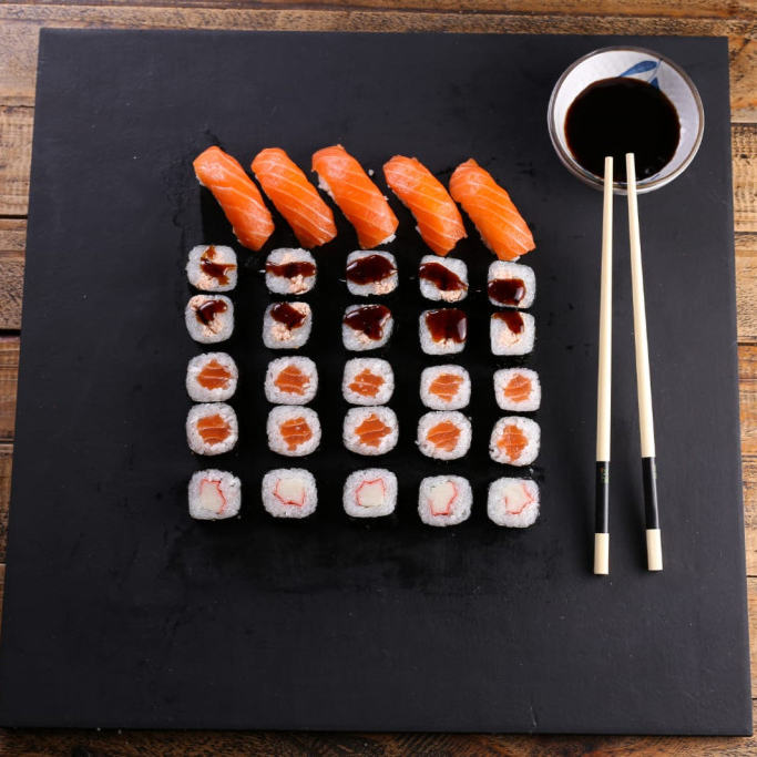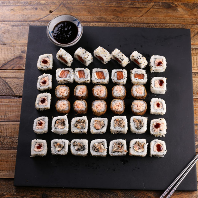 10-sashimi 5-niguiri de salmão 3- niguiri maçaricado 2- jow de salmão 5- hot holl especial 5-uramaki especial 5-uramaki de kani 5-uramaki de salmão 10- hossomaki 10-hot holl
