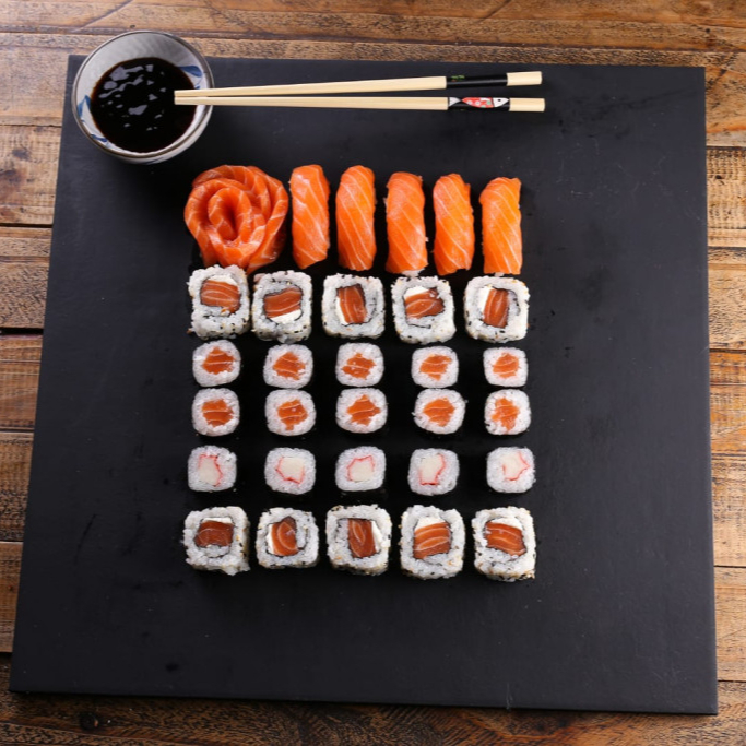 5 -sashimi de salmão, 5 - niguir de salmão, 10 - uramaki de salmão, 10 - hossomaki de salmão, 5 - kanimaki *este combinado não pode sofrer alteração*