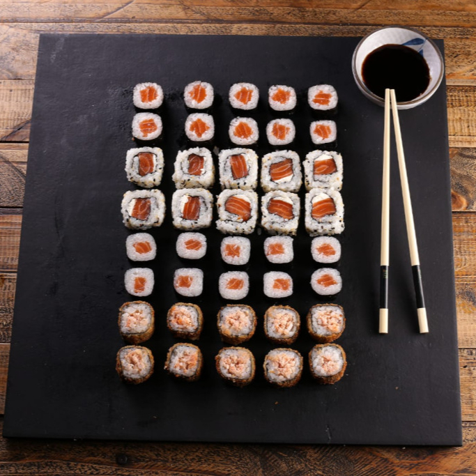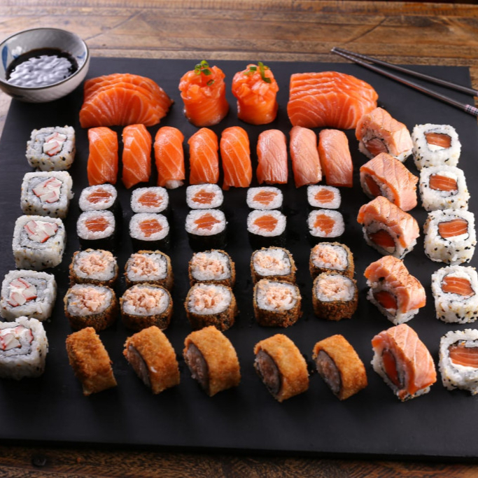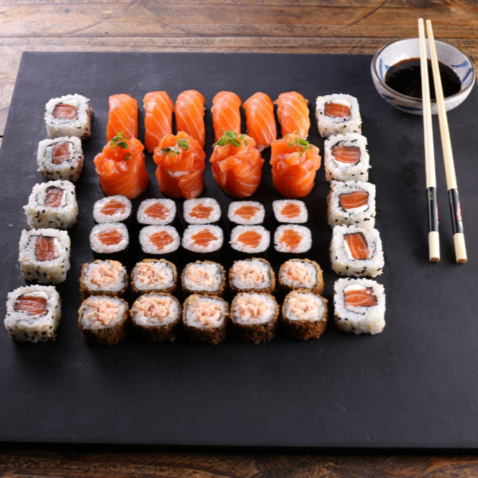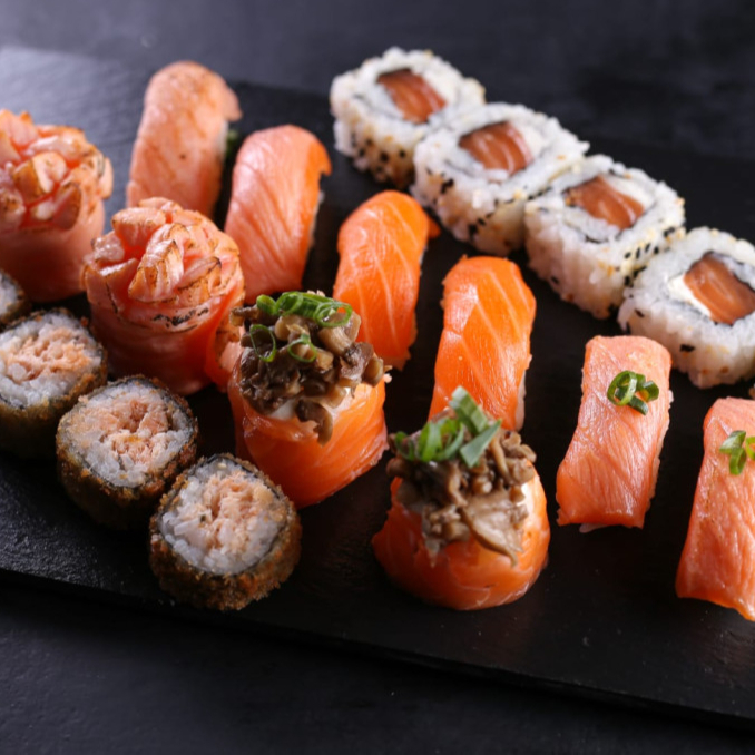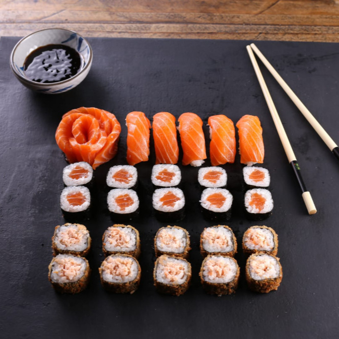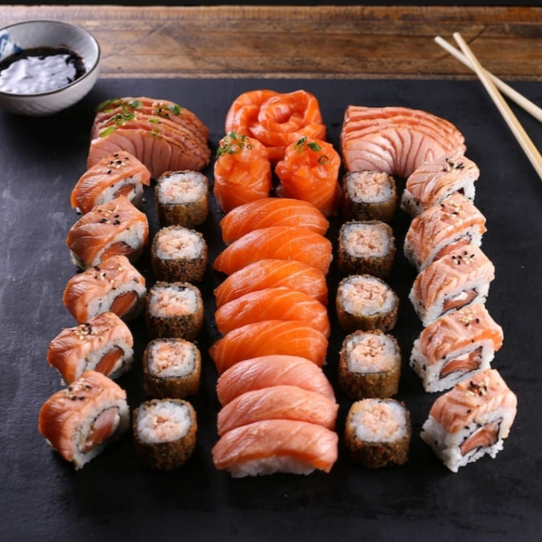 4-jow de salmão 6-niguiri de salmão 10-hossomaki de salmão 10-hot holl 10-uramaki de salmão