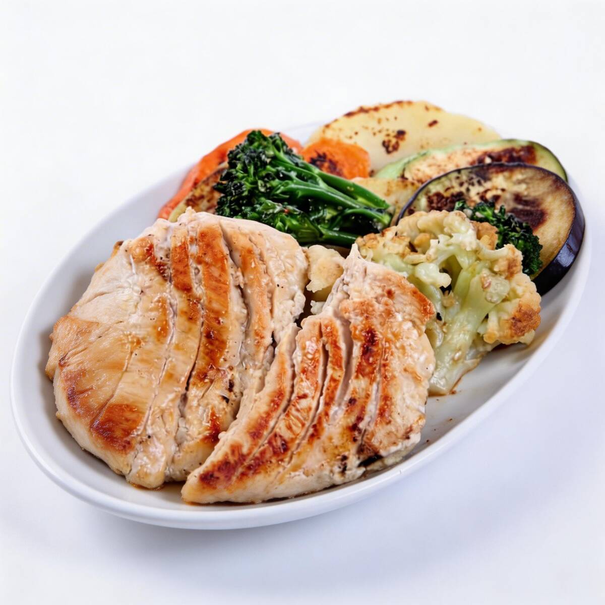 Frango grelhado na chapa com legumes levemente refogado e temperado acompanha gohan
