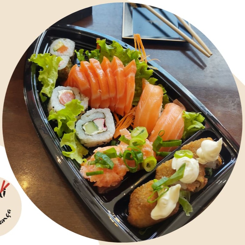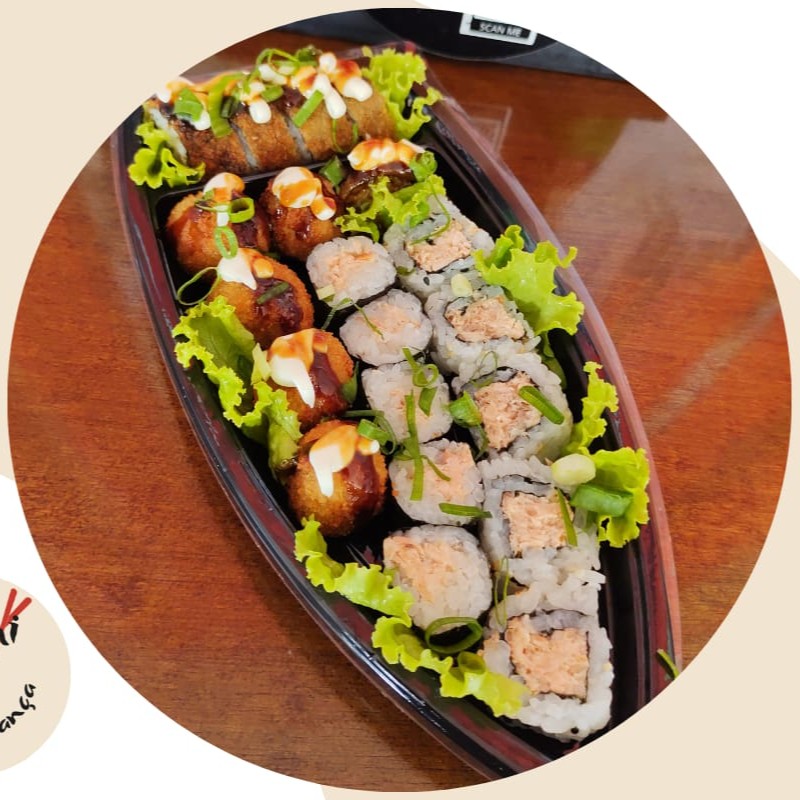 1 temaki á sua escolha, 4 sashimis, 2 niguiri, 2 jyo, 2 uramakis, 2 hossomakis, 2 hot roll.