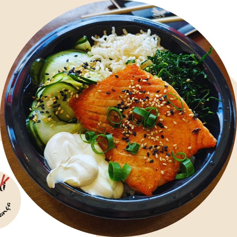 Arroz (de sushi) com 1 pedaço de salmão grelhado, cream cheese, sunomono, couve crispy, amendoim, crispy de bifum, cebolinha e gergelim. Embalagem de 500ml.