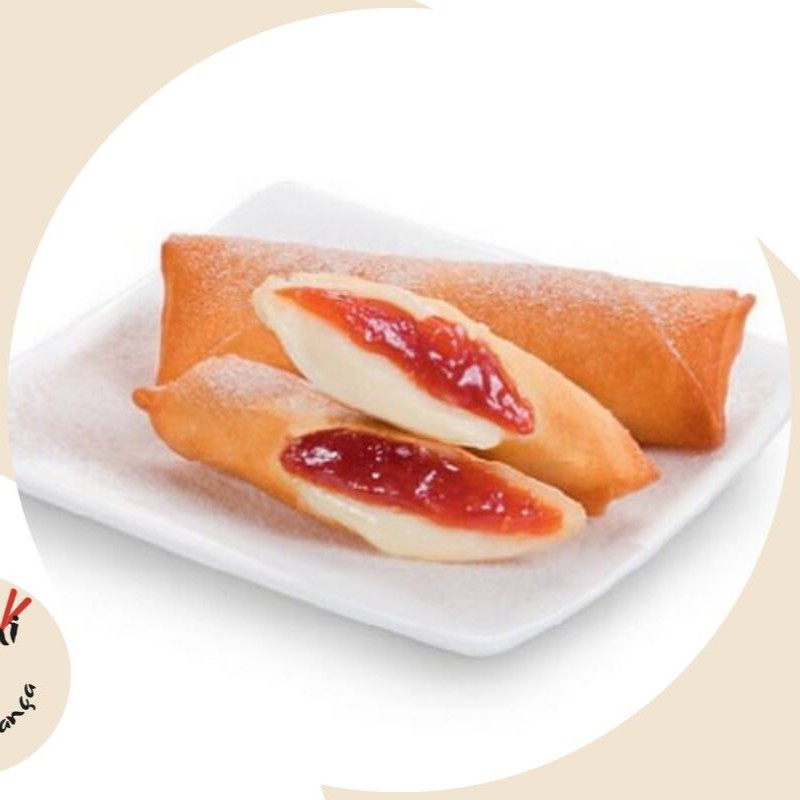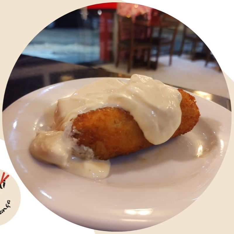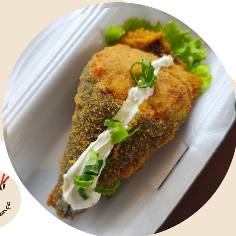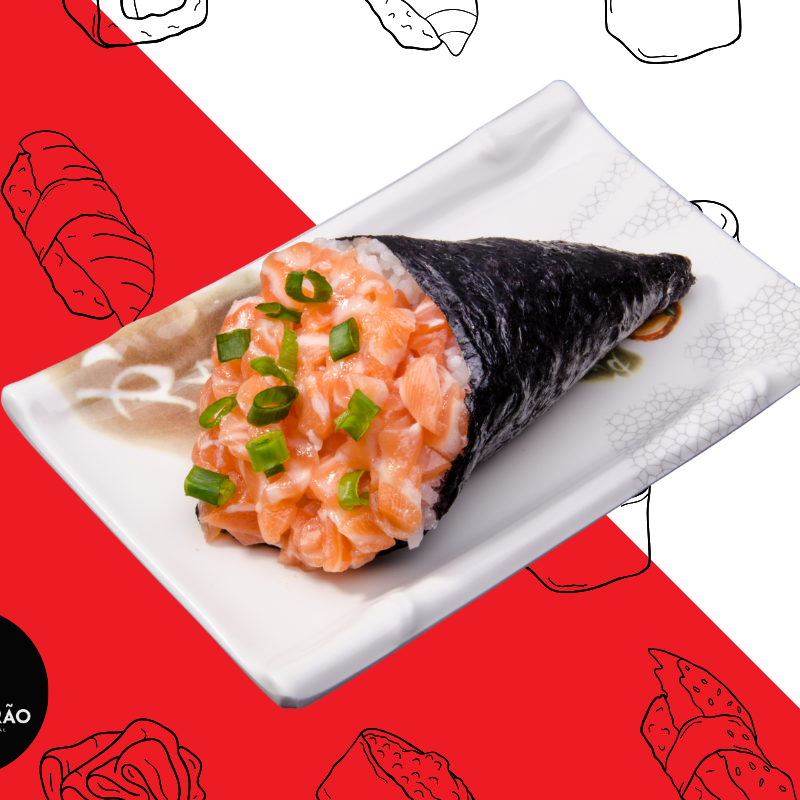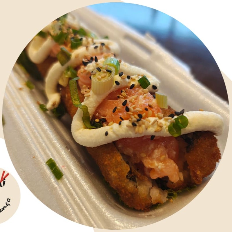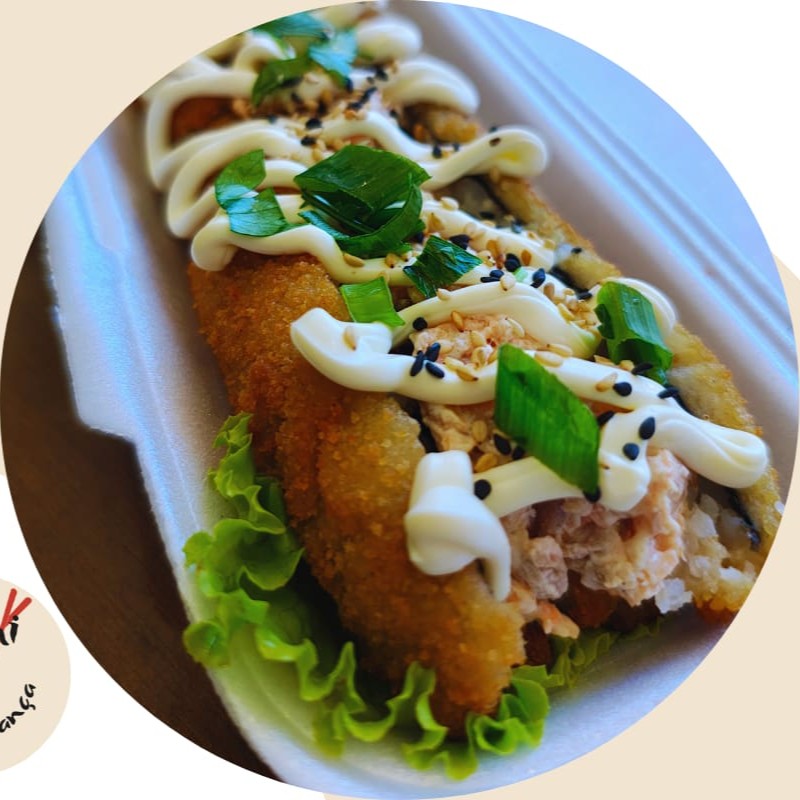 Temaki empanado na farinha panko e frito, com recheio de salmão grelhado com cream cheese e cebolinha.