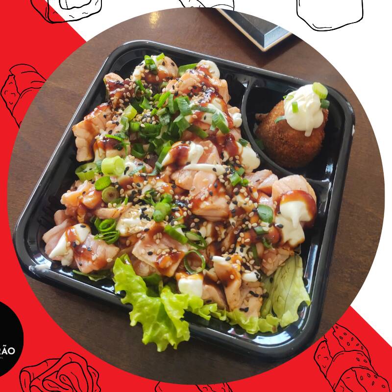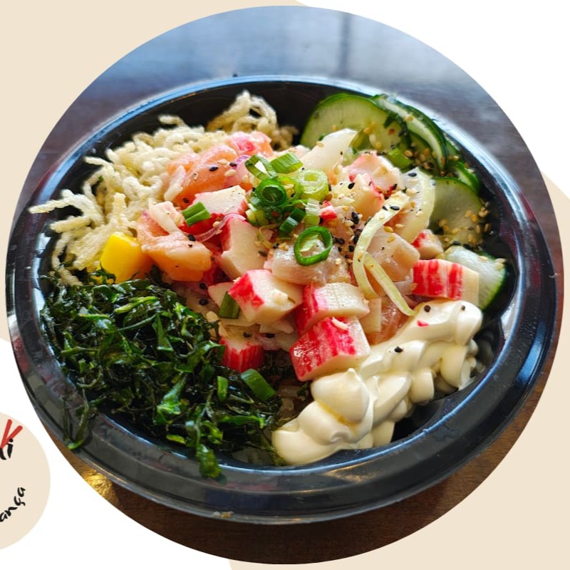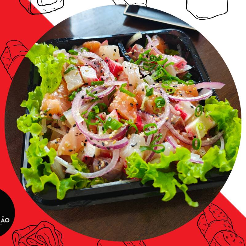 Arroz sashi (de sushi) coberto com Ceviche (Pedaços de salmão, tilápia, kani e manga, ao molho do chefe), com sunomono, couve crispy, amendoim, crispy de bifum, cream cheese, cebolinha e gergelim. Embalagem de 500ml.