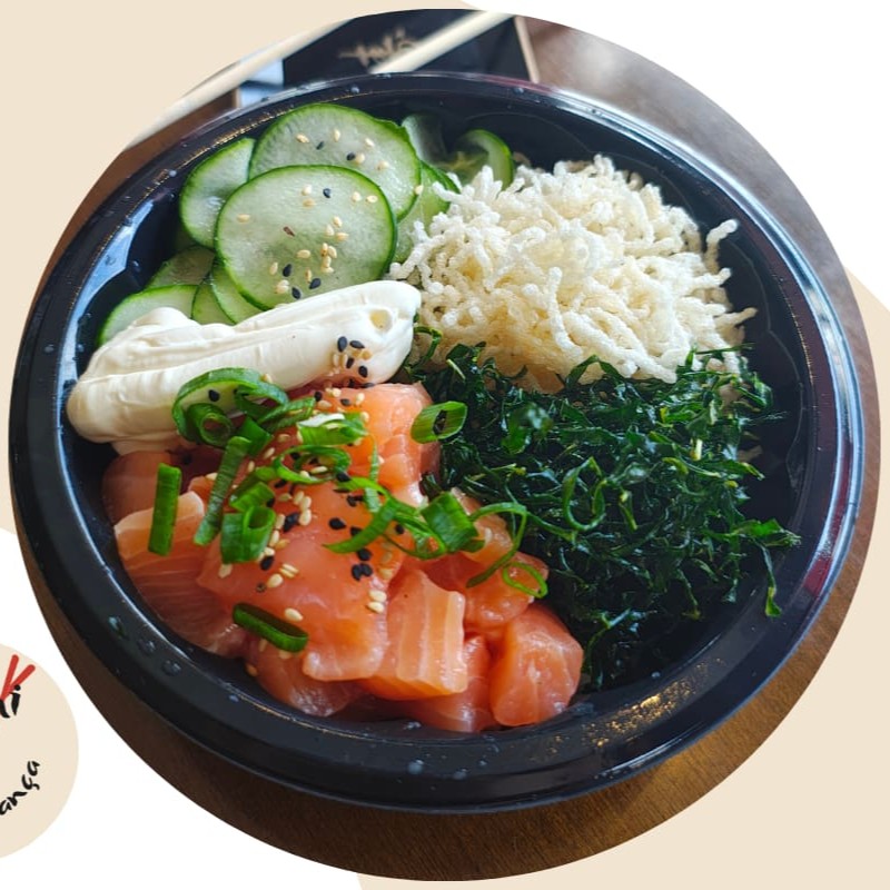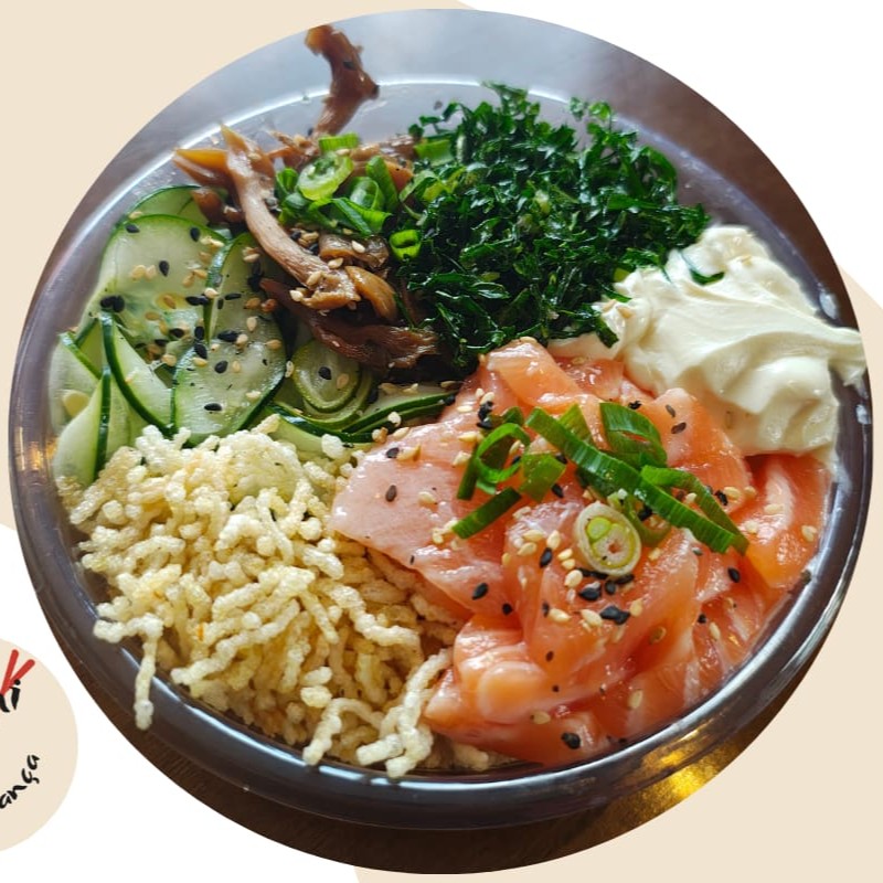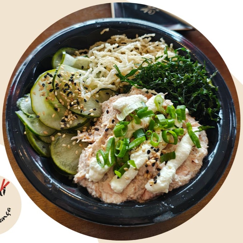 Arroz (de sushi) coberto com salmão em cubos, sunomono, couve crispy, amendoim, crispy de bifum, cream cheese, cebolinha e gergelim. Embalagem de 500ml.