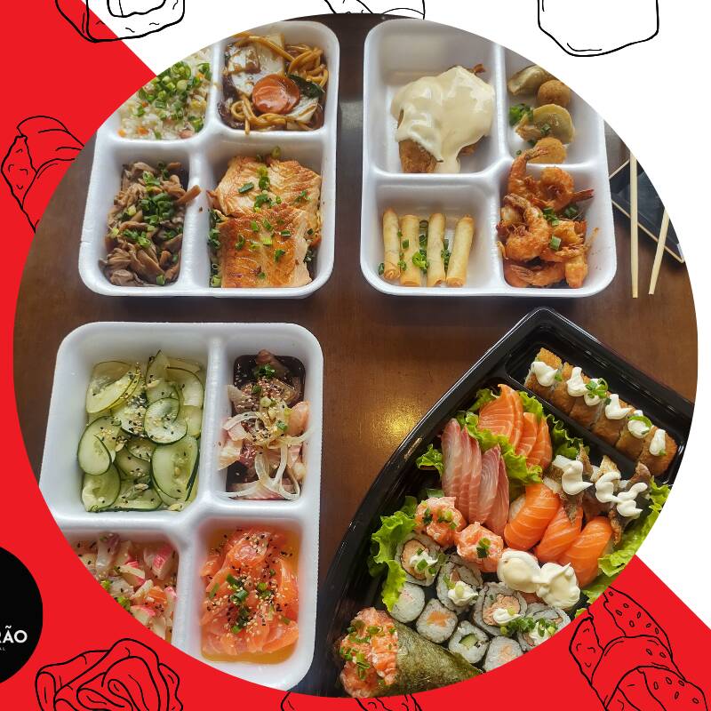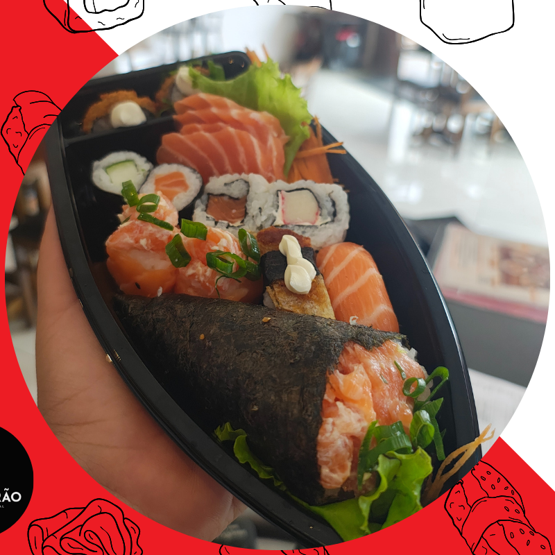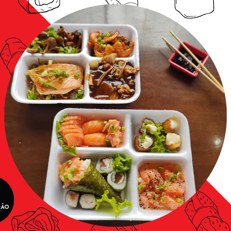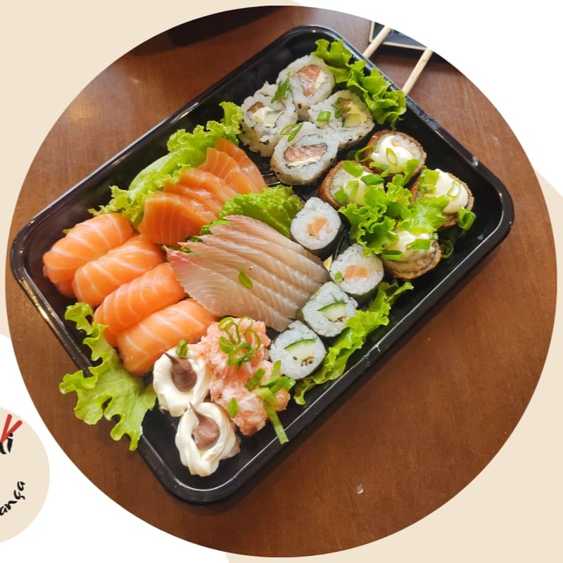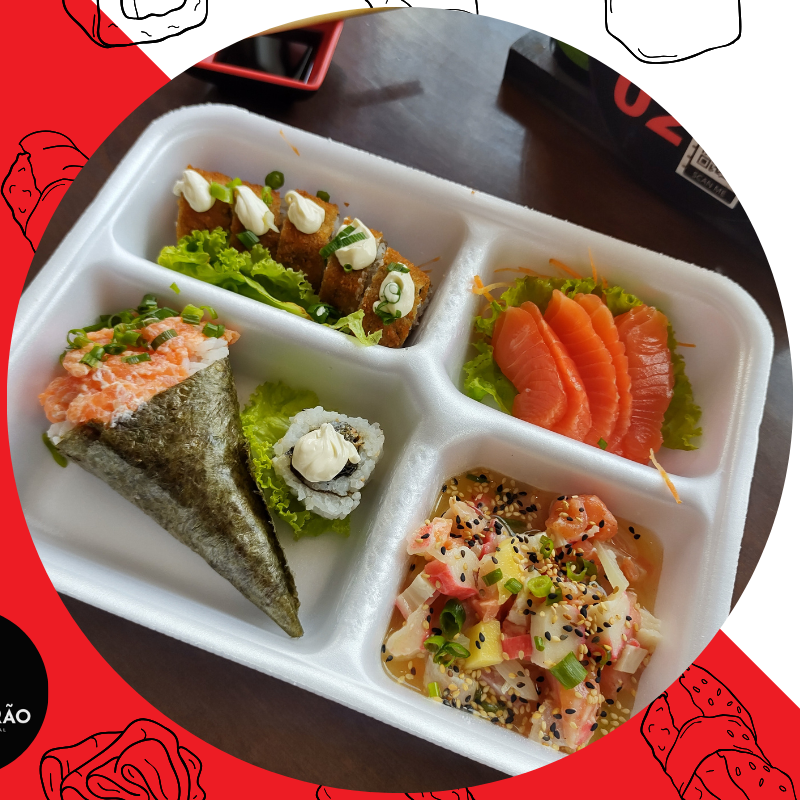 - Pratos Frios 1 Sasaki de salmão 1 Mini temaki de salmão ( cru ou grelhado) 5 Sashimis de salmão 2 Hot holls - sushi 2 Hot doce - sushi 2 Jyos - sushi 2 Hossomakis - sushi 2 Uramakis - sushi 2 Niguiris - sushi - Pratos Quentes 1 Teppan de salmão (Salmão grelhado) 8 Camarão no alho e óleo 1 Yakissoba Clássico 1 Shimeji Atenção: Esse prato não pode sofrer alteraç