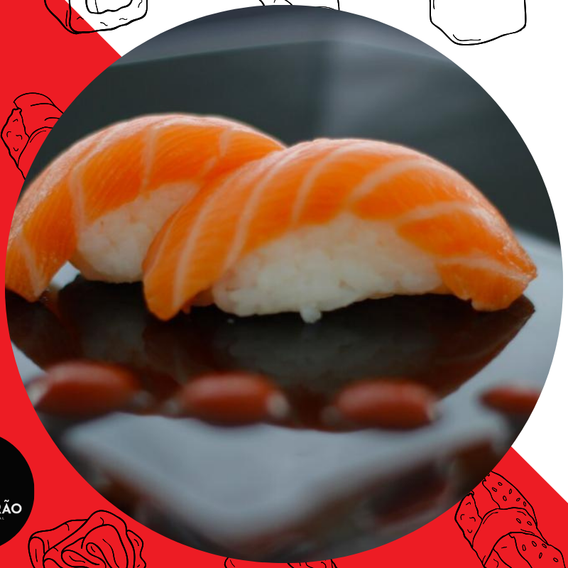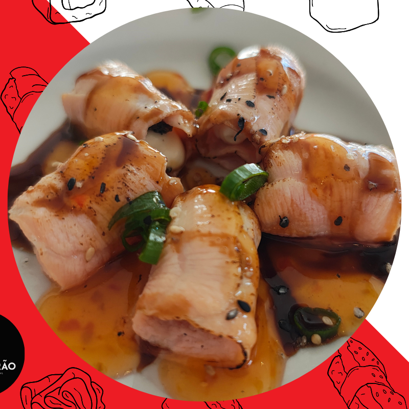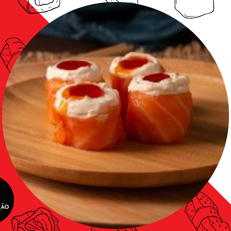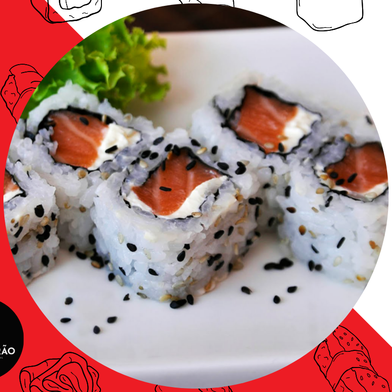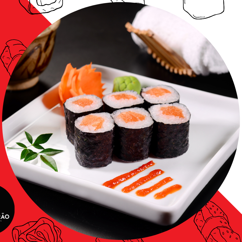 5 Hot rolls sushi, 5 boinhos de salmão, 5 Uramaki de salmão grelhado, 5 Hossomaki de salmão grelhado.